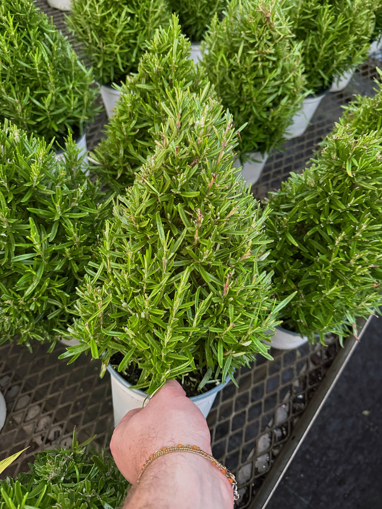 Le Romarin (Rosmarinus officinalis) est un arbrisseau aromatique méditerranéen, souvent taillé en forme d’arbre ou de petit topiaire pour la culture intérieure. Les feuilles sont persistants, fins, aromatiques, vert foncé dessus et légèrement argentés dessous. Il est très parfumée, libérant une huile essentielle apaisante et fraîche. Il peut atteindre entre 30 et 80cm de hauteur, selon la fréquence des tailles d'entretien.