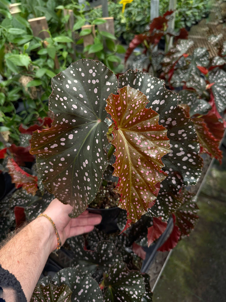 A funky colored begonia! Its asymmetrical dark-colored foliage spotted with pink and red underneath does not go unnoticed. In order to maintain its small, compact shape, it is advisable to pinch/trim the ends of the stems.