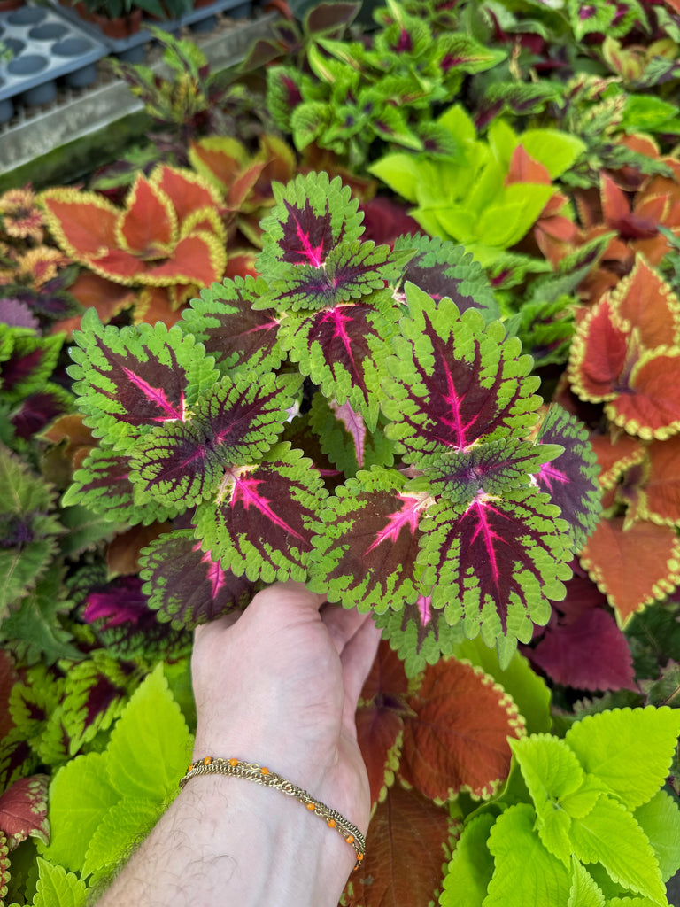 Coleus is very renowned for the beauty of its foliage. The 'Watermelon' variety has small lobed red-pink leaves bordered with green. In order to keep its shape compact, it is recommended to regularly pinch the tips of the stems. Also, during its growth period, it fears drought and prefers its soil to remain slightly humid.