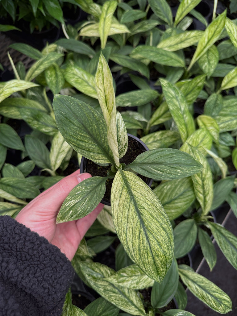 A classic indoor plant. Also called moonflower, due to its white, half-moon-shaped blooms. The 'Jessica' variety has heavily cream-variegated foliage. Its long, lanceolate leaves communicate its needs. Indeed, when the Spathiphyllum lacks water, its leaves quickly lose their tone. A plant that grows in the shade of trees in tropical rainforests. The Spathiphyllum is highly valued for its tolerance to low light. To promote its growth and inflorescence, it prefers high ambient humidity and bright, indirect light.