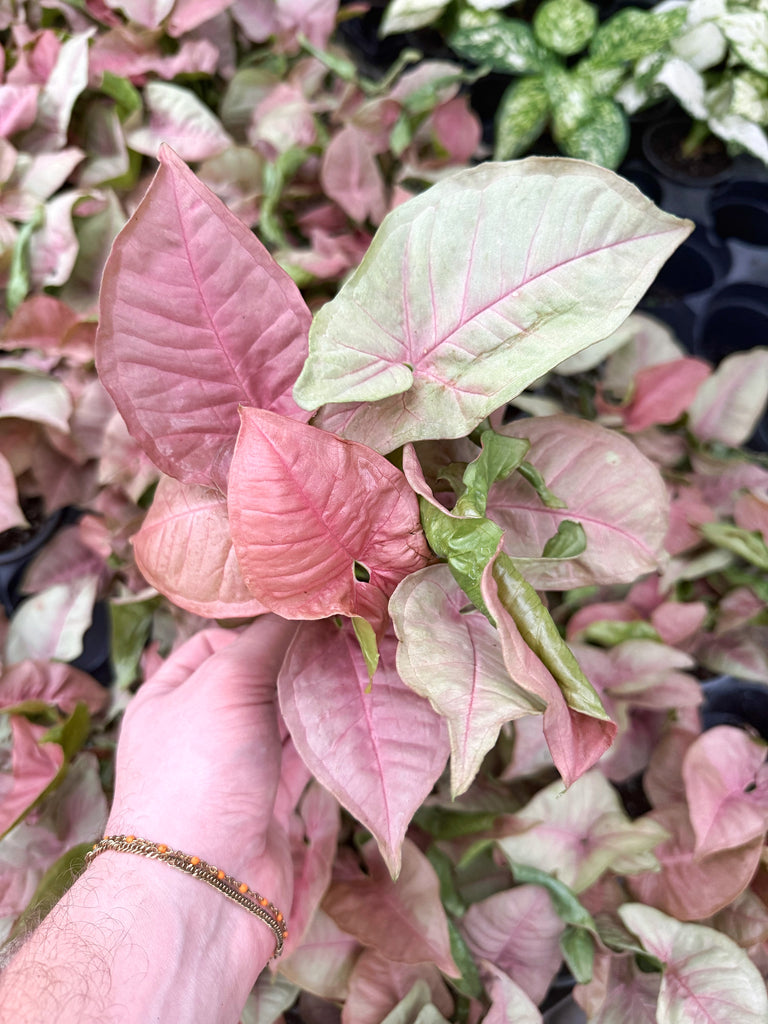 A unique plant for its colorful foliage. 'Neon Robusta' features shades of creamy pink mixed with pale green. An ideal plant for those who tend to overwater. It is recommended to allow the soil surface to dry out between waterings. However, Syngonium tolerates more frequent and heavy watering.