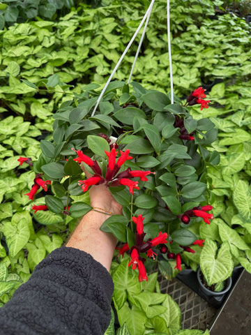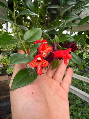 Appelé 'Plante Rouge à Lèvres' par l’apparence de ses fleurs. En effet, les petites fleurs tubulaires de couleur rouge ressemblent à un rouge à lèvre. Un apport d’engrais régulier et une lumière vive est nécessaire pour sa floraison. À des conditions optimales, sa floraison est abondante et peut durer tout l’été! Une plante idéale en suspension grâce à ses longues tiges retombantes et ses grandes feuilles vertes.