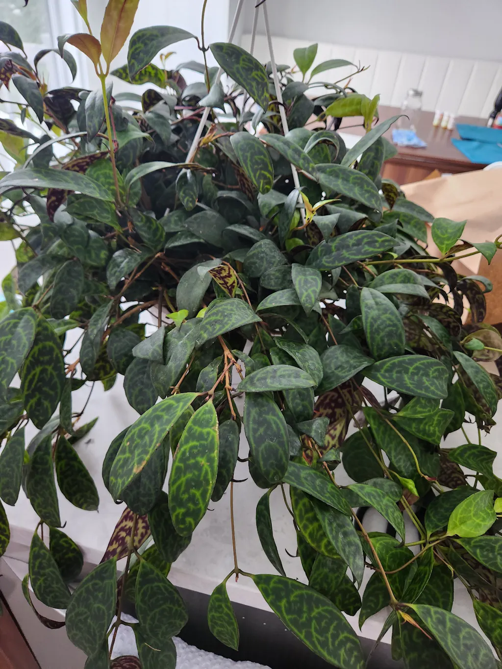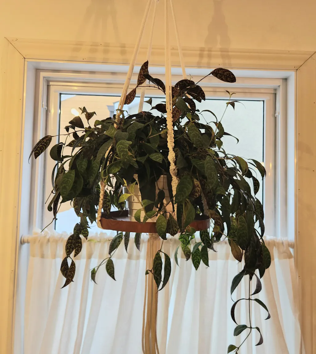 Aeschynanthus Longicaulis ‘Black Pagoda’ est une variété unique de la plante à rouge à lèvres, appréciée pour son feuillage marbré spectaculaire et ses fleurs tubulaires orangées. C'est une plante idéale pour les suspensions, grâce à son port retombant et son entretien facile. Nous adorons sa coloration vert foncé avec des marbrures argentées sur le dessus et un revers pourpre intense. Un apport d’engrais régulier et une lumière vive est nécessaire pour sa floraison. À des conditions optimales, sa floraison est abondante et peut durer tout l’été!