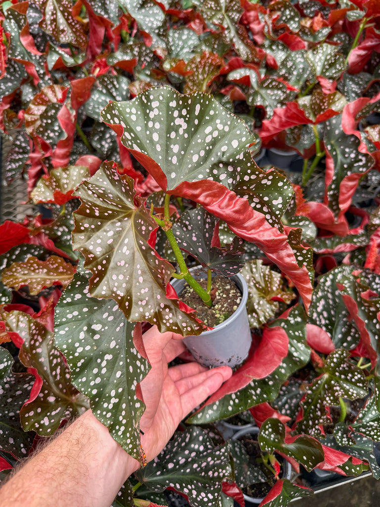 Un bégonia aux couleurs funky! Son feuillage asymétrique de couleur foncée tachetée de rose et au dessous rouge ne passe pas inaperçu. Afin de conserver son petit port compact, il est conseillé de pincer/tailler le bout des tiges.