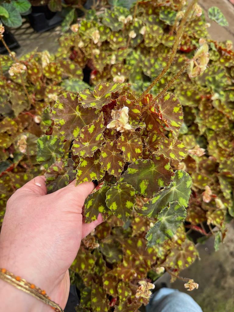 Un bégonia qui se démarque par la coloration de son feuillage. Ses feuilles asymétriques sont de couleur bourgogne picoté de vert. À condition optimale de croissance, sa floraison peut durer plusieurs mois et se produire à n'importe quel moment de l'année.