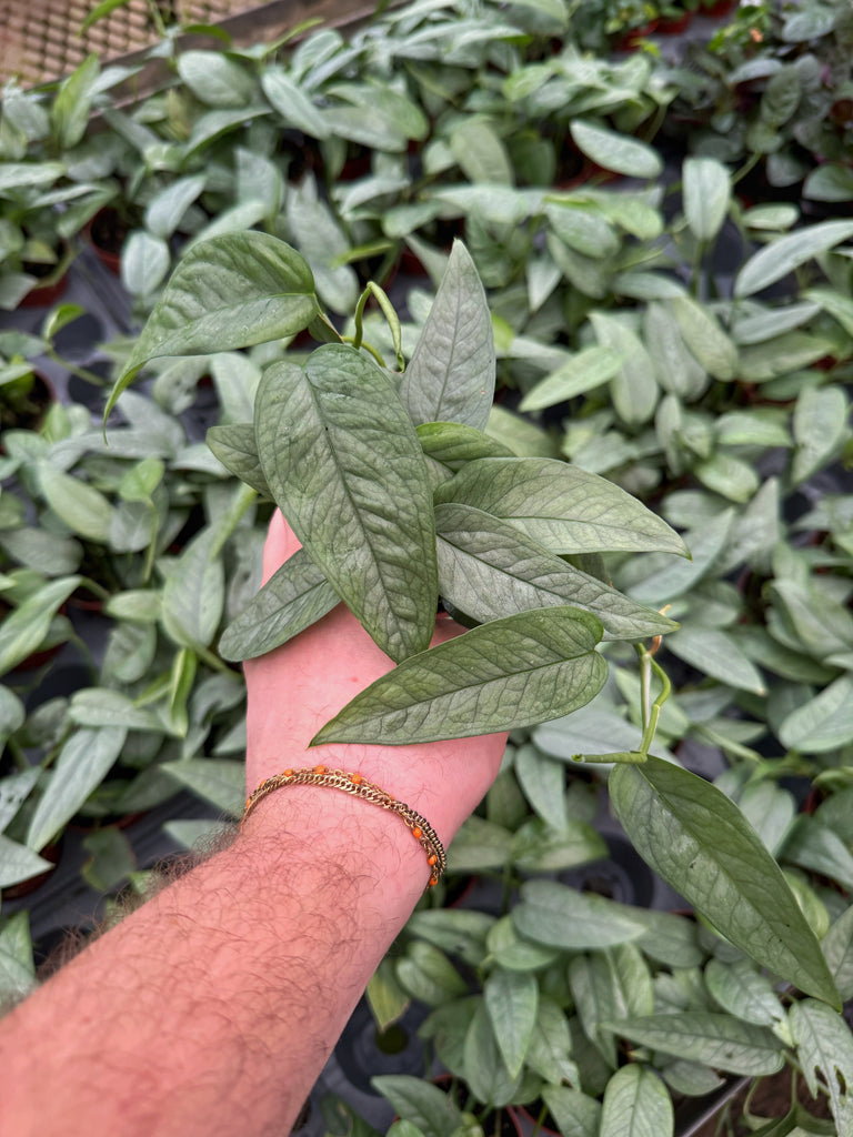 Cette variété de pothos plus rare se distingue par son esthétisme unique. Ses feuilles sont allongées et sa couleur bleu argenté est envoûtante. Ses longues tiges se placent très bien dans un pot suspendu ou dans un arrangement pour plante grimpante. Les Pothos sont des plantes épiphytes, alors les racines aériennes peuvent être entraînées pour grimper sur un support. À maturité, le feuillage du pothos Cebu Blue se découpe comme son cousin le Monstera Deliciosa, par contre la découpe de son feuillage est possible uniquement lorsqu'il se développe sur un support.