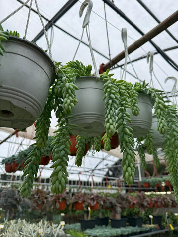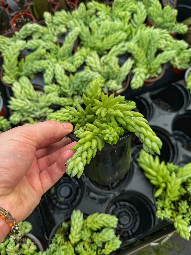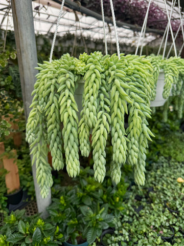 Une adorable succulente de rocaille, ce qui lui permet de tolérer un sol sec et pauvre. La variété 'Donkey's Tail' possède un port dense, des petites feuilles vertes charnues et allongées très rapprochées. Il porte plusieurs petites tiges dressées et devient semi-rampant. Il est très apprécié pour son adaptation à une luminosité modérée. Afin de favoriser sa croissance et sa coloration vive, il est recommandé de l’installer à lumière vive. Également, ses tiges se placent très bien dans un pot suspendu.