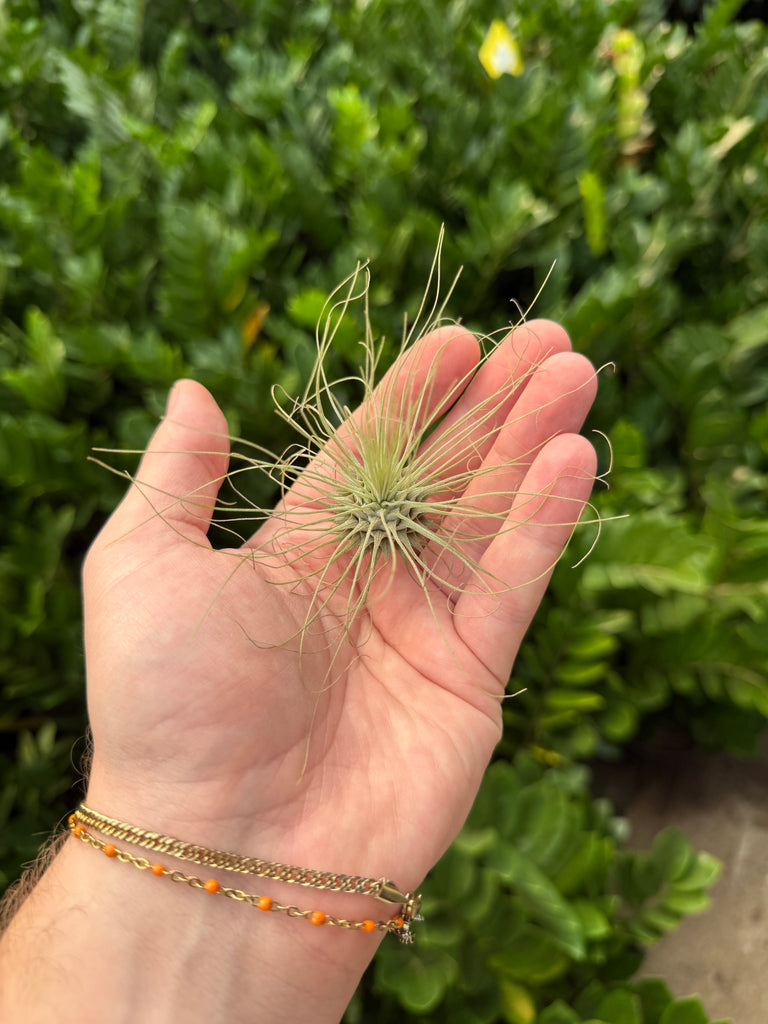 Il s'agit d'une magnifique plante épiphyte qui ne nécessite aucun terreau! Cette variété est petite et très fine, avec des feuilles grises argentées, très étroites, filiformes et légèrement recourbées. Le feuillage forme une rosette en boule aérée et douce au toucher, presque plumeuse. Comme la majorité des tilandsias, il produira des jolies petites fleurs violets. Environ une fois semaine, on la fait tremper dans de l'eau à température pièce durant une dizaine de minutes ou bien on peut l'accrocher au pommeau durant la douche. Suite à l'humidification de votre plante, vous pouvez la remettre en place.