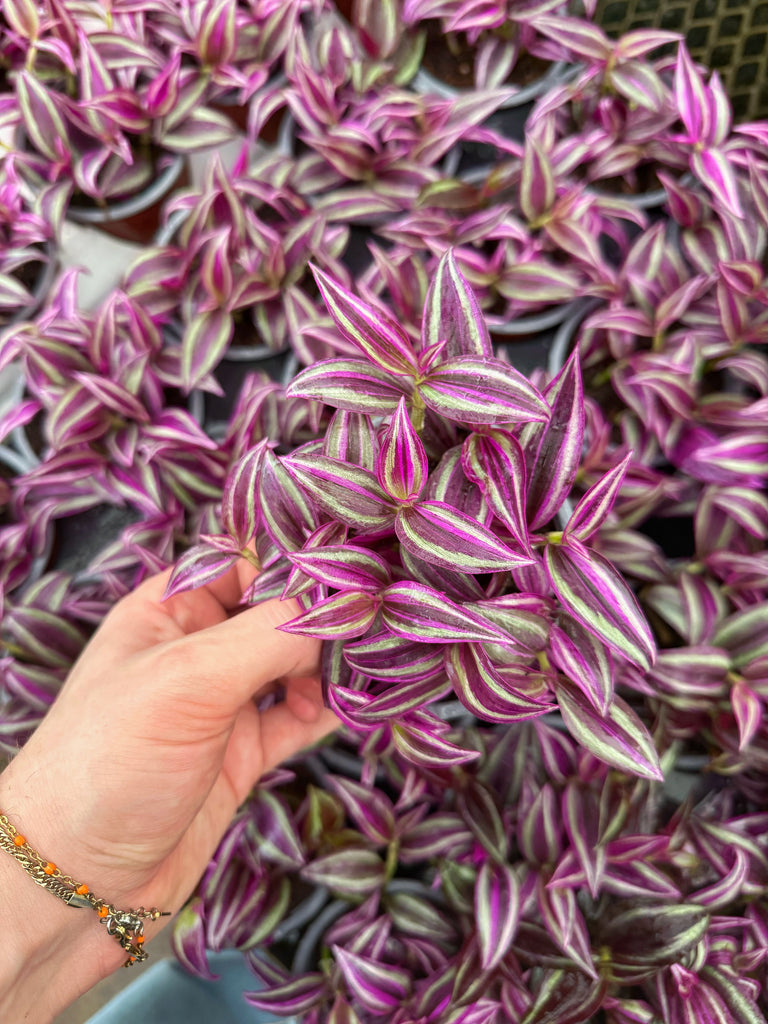 Une magnifique plante retombante qui se démarque par la coloration scintillante de son feuillage. Les feuilles duveteuses sont possèdent une face supérieure de bandes argentées, vert foncé et violet profond, avec un aspect métallique. Tandis que la face inférieure est de couleur violet intense, presque pourpre foncé. Les tiges sont pourpres à violettes, cassantes mais faciles à bouturer.